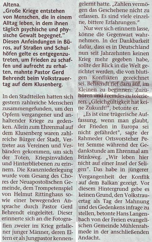 Wie auch in den vergangenen Jahren hat am Volkstrauertag 2007 der Chor der Gemeinde Altena bei der Feierstunde zum Gedenken der Opfer der vergangenen und anhaltenden Kriege am Ehrenmal auf dem Klusenberg mitgewirkt. Es waren wieder zahlreiche Bürger der Stadt, Vertreter der Stadtverwaltung und Vertreter aus Vereinen und Verbänden gekommen, um sich der Toten, Krieginvaliden und Hinterbliebenen zu erinnern. Die Feierstunde wurde vom Gesang des Chores eingeleitet und beendet. Mit einem Trompetensolo und einem weiteren Lied des Chores wurde die Kranzniederlegung begleitet. Der Bürgermeister der Stadt Altena bedankte sich bei allen Sängern herzlich. Dies war wieder einmal ein kleiner Beitrag zur Öffentlichkeitsarbeit.